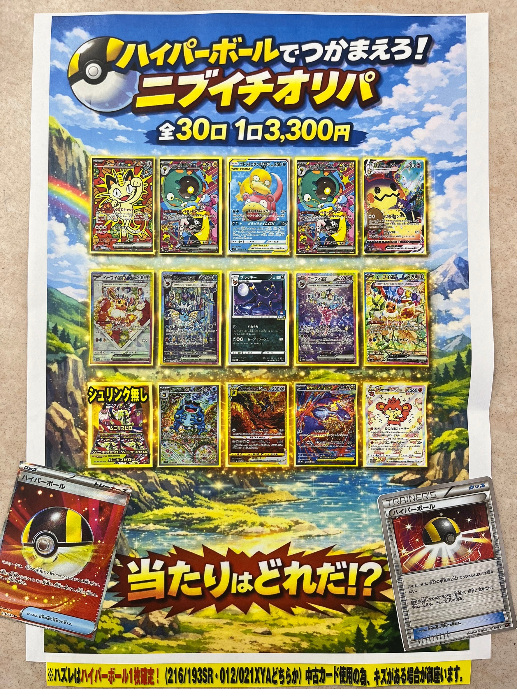 【住吉買取店】ニブイチオリパ販売開始しました。 マンガ倉庫住吉買取店 2026年3月19日 住吉買取店 ポケモンカードハイパーボールでつかまえろ! ニブイチオリパ販売開始しました。 全30口 1口3,300円 1/2で画像内の当たり確定‼︎ ハズレはハイパーボールSRかハイパーボールXYノーマルになります。 中古カード使用の為、キズがある場合が御座います。