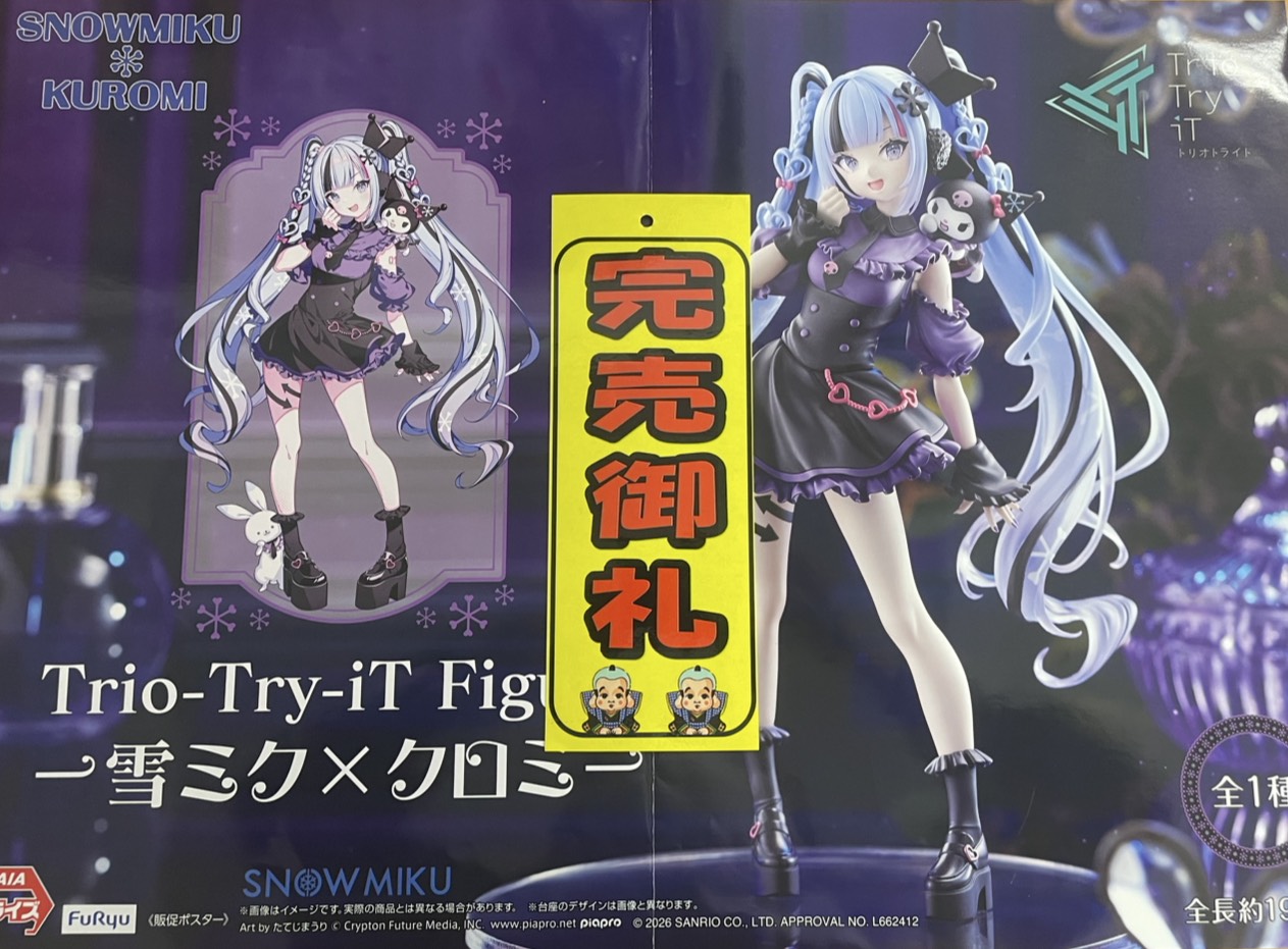 【加納店】加納店アソビバ景品完売情報です! マンガ倉庫加納店 アミューズ 2026年2月21日 加納店 アソビバ景品完売情報です! ・雪ミク×クロミ TrioーTryーiT Figure 【全1種】 こちらの景品、ご好評につき完売致しました!