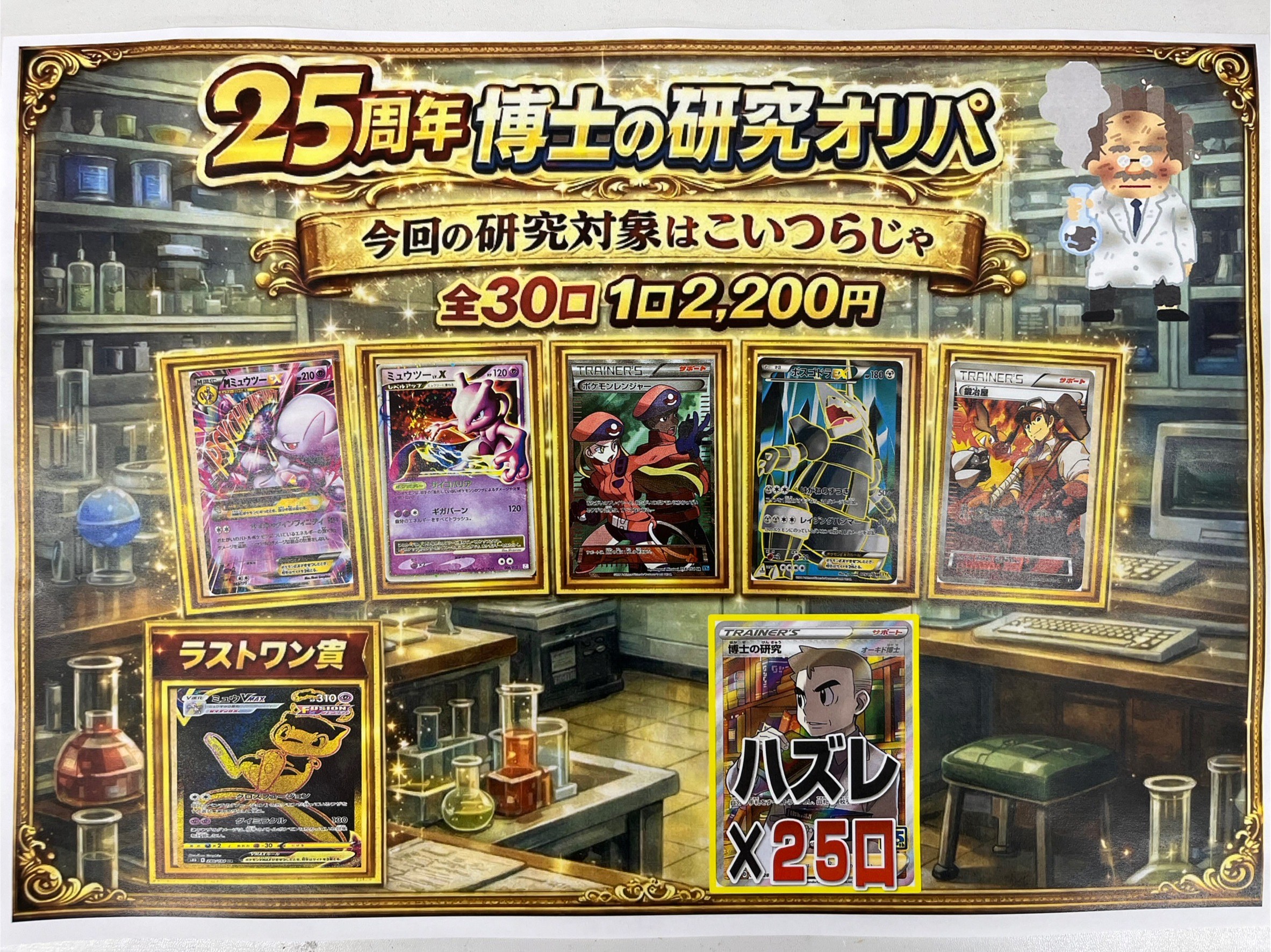 【住吉買取店】ポケモンカードオリパ 25周年博士の研究オリパ開始! マンガ倉庫住吉買取店 トレカ 2026年3月2日 住吉店 ポケモンカードオリパ 25周年博士の研究オリパ開始! 全30口 1口2,200円 ラストワン賞に幻のポケモンミュウUR ※全て中古カードを使用している為、傷がある場合が御座います。 予めご了承下さい。