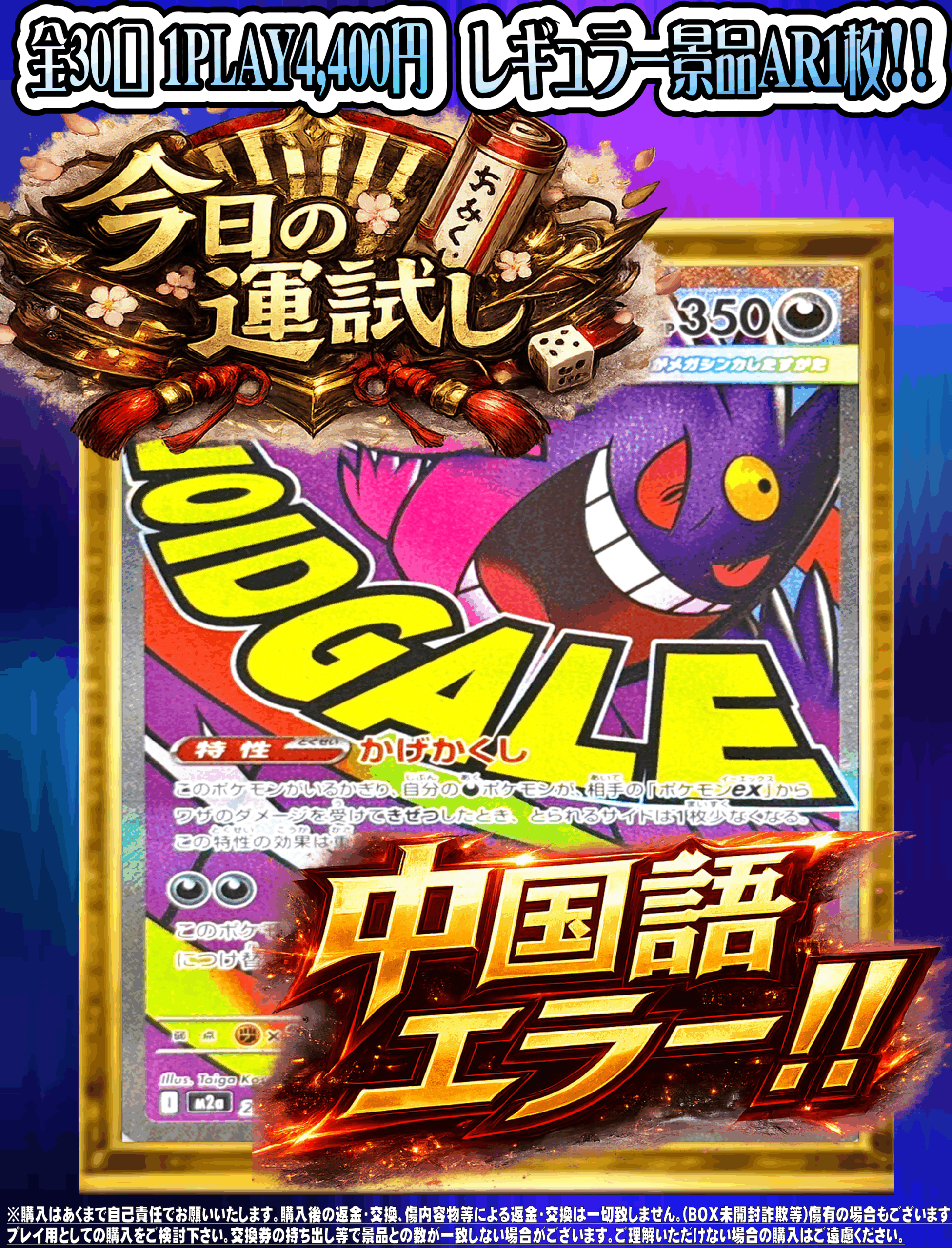 【加納店】⚡️本日発売開始⚡️ お待たせしました! 【メガゲンガー エラー版 争奪パック】 マンガ倉庫加納店 トレカ 2026年4月5日 加納店 ポケモンカード ⚡️本日発売開始⚡️ お待たせしました! 【メガゲンガー エラー版 争奪パック】、ただいまより販売スタートです! 💥今回の大当たりは… 【メガゲンガー MA (中国語エラー版)】!!💥 コレクター垂涎!幻のエラーカードを、衝撃封入! ✅1口 4,400円 ✅少数限定 全30口 ✅AR1枚確定! 幻のエラーカードを手に入れるのは誰だ!?