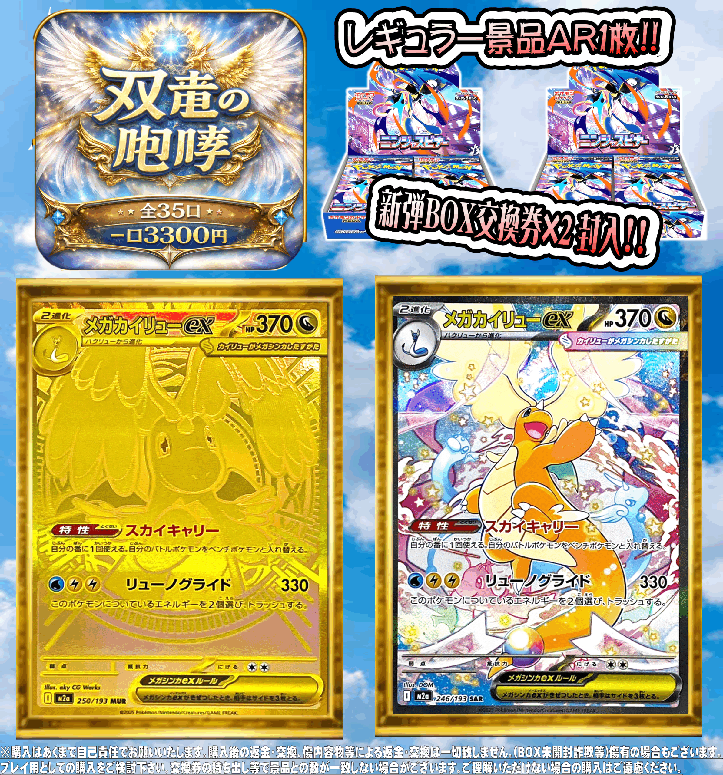 【加納店】ポケモンカード ⚡️本日発売開始⚡️ マンガ倉庫加納店 トレカ 2026年4月6日 加納店 ポケモンカード ⚡️本日発売開始⚡️ お待たせしました! 【Wメガカイリュー争奪&BOXパック】、ただいまより販売スタートです! 💥今回の大当たりは… 【メガカイリュー MUR&SAR】!!💥 心優しき最強ドラゴン、その超希少&最高峰の2枚を豪華W封入! さらに『ニンジャスピナーBOX』も封入しております! ✅1口 3,300円 ✅少数限定 全35口 ✅AR1枚確定! 伝説のWドラゴンを手に入れるのは誰だ!?