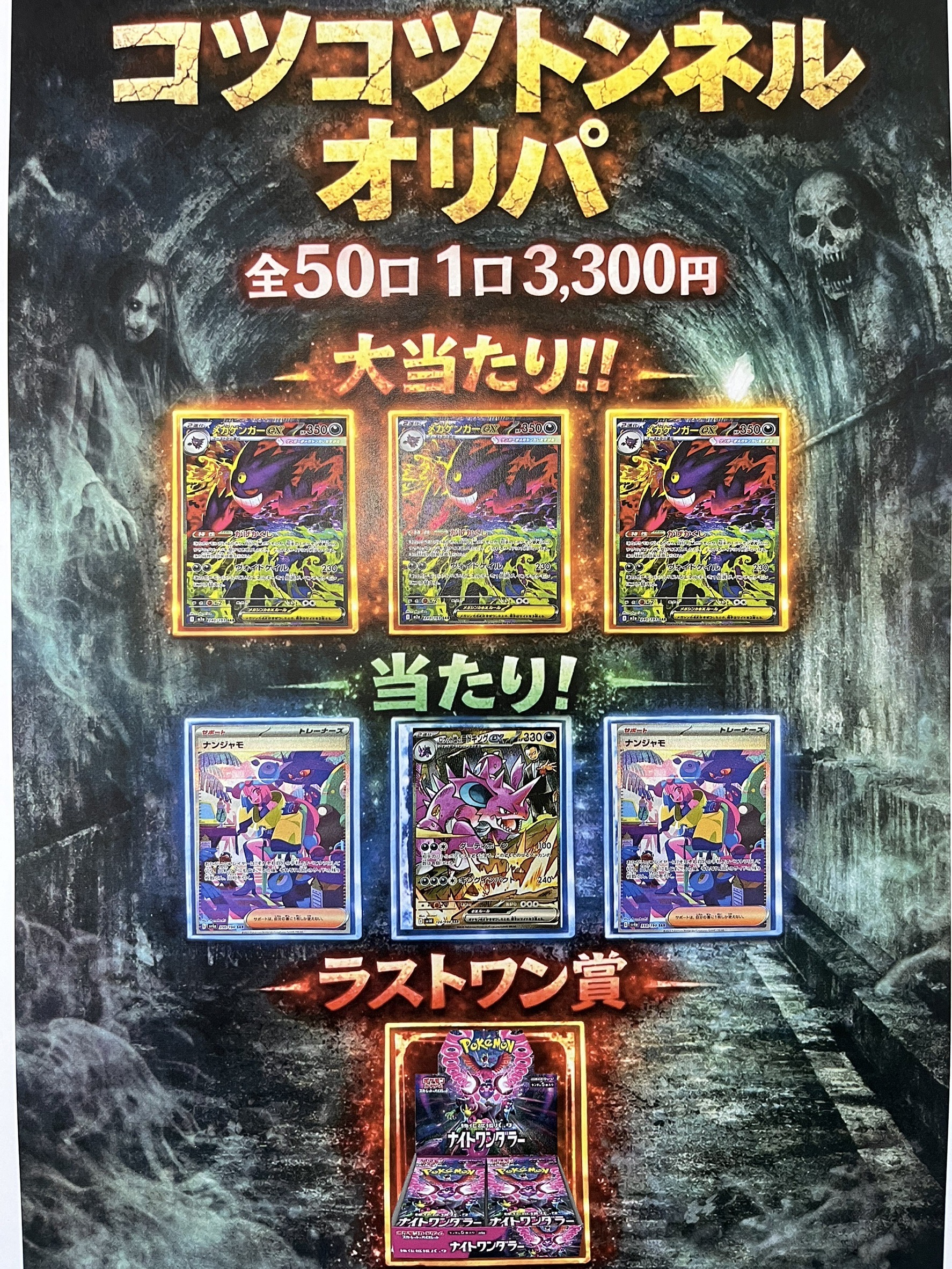 【住吉買取店】ポケモンカード 💀コツコツトンネル💀オリパ販売開始しました。 こんなの買取りました マンガ倉庫住吉買取店 トレカ 2026年4月7日 ポケモンカード 💀コツコツトンネル💀オリパ販売開始しました。 全50口 1口3,300円 大当たり メガゲンガーex SAR1枚×3口ご用意しております。 ※全て中古カードを使用しており、傷がある場合が御座います。 予め、ご了承下さい。