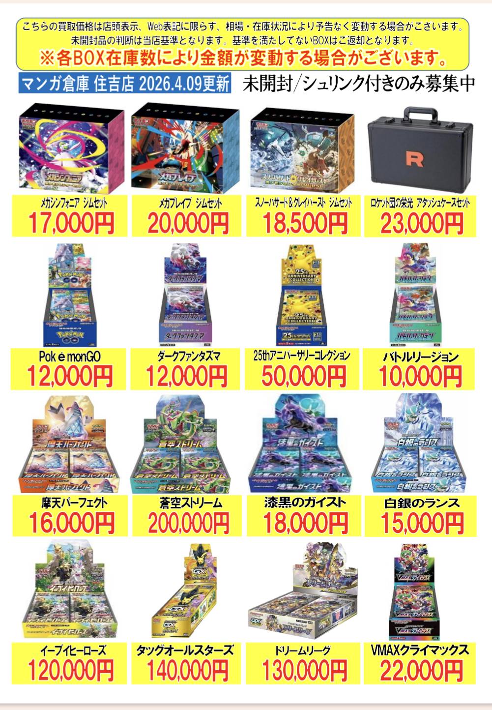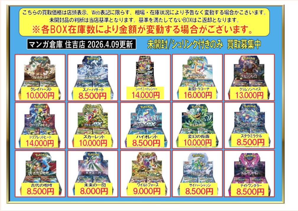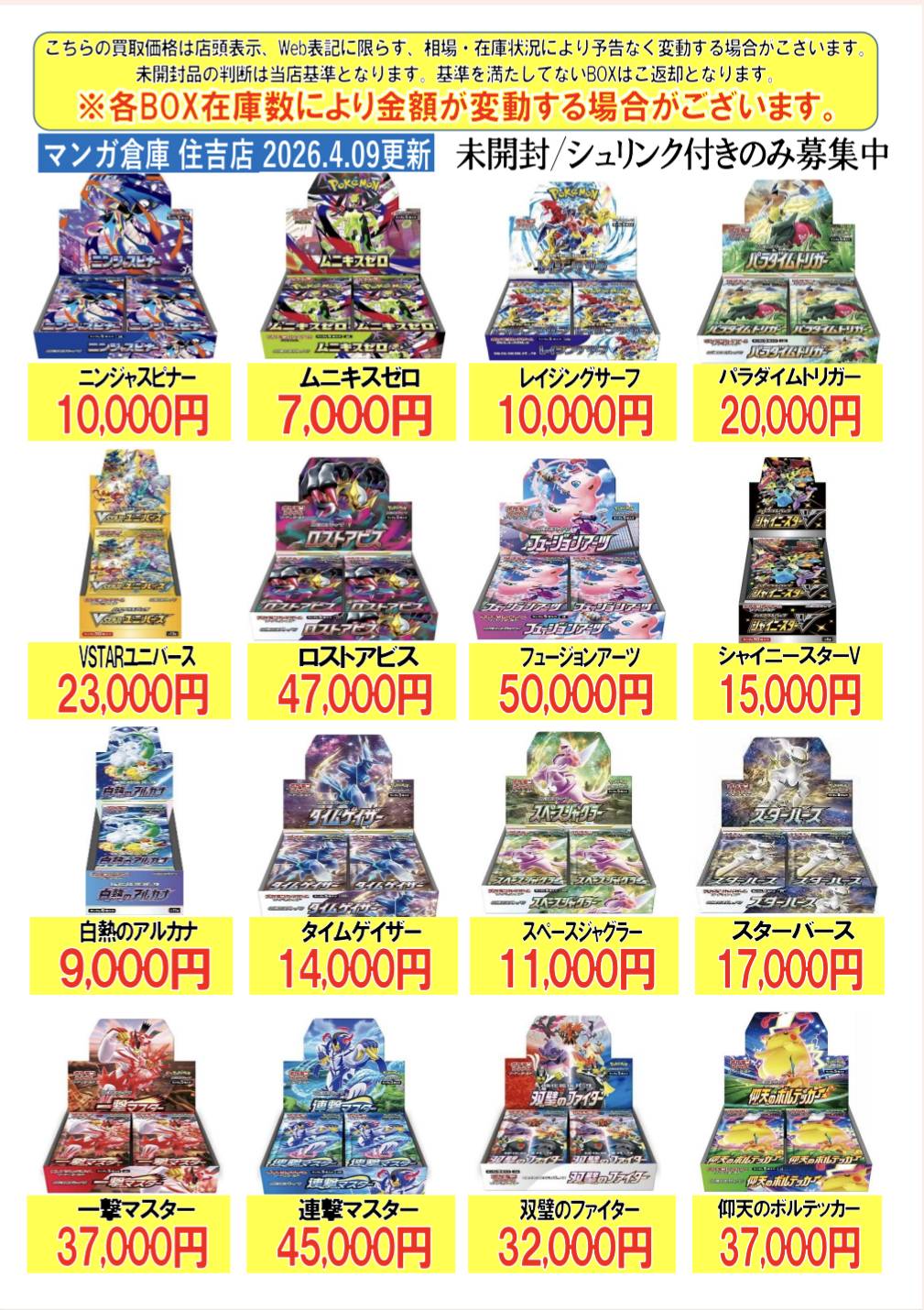 【住吉買取店】ポケモンカードBOX買取金額を更新致しました。 買取情報 マンガ倉庫住吉買取店 トレカ 2026年4月9日 ポケモンカードBOX買取金額を更新致しました。 ※2026/4/9現在の価格となります。 在庫状況・状態によってお値段が変動いたします。予めご了承ください。 **************** こちら↓もぜひチェックしてみてくださいね♪(*´▽`*) ・最新のイベント情報はこちら ・最新の買取情報はこちら
