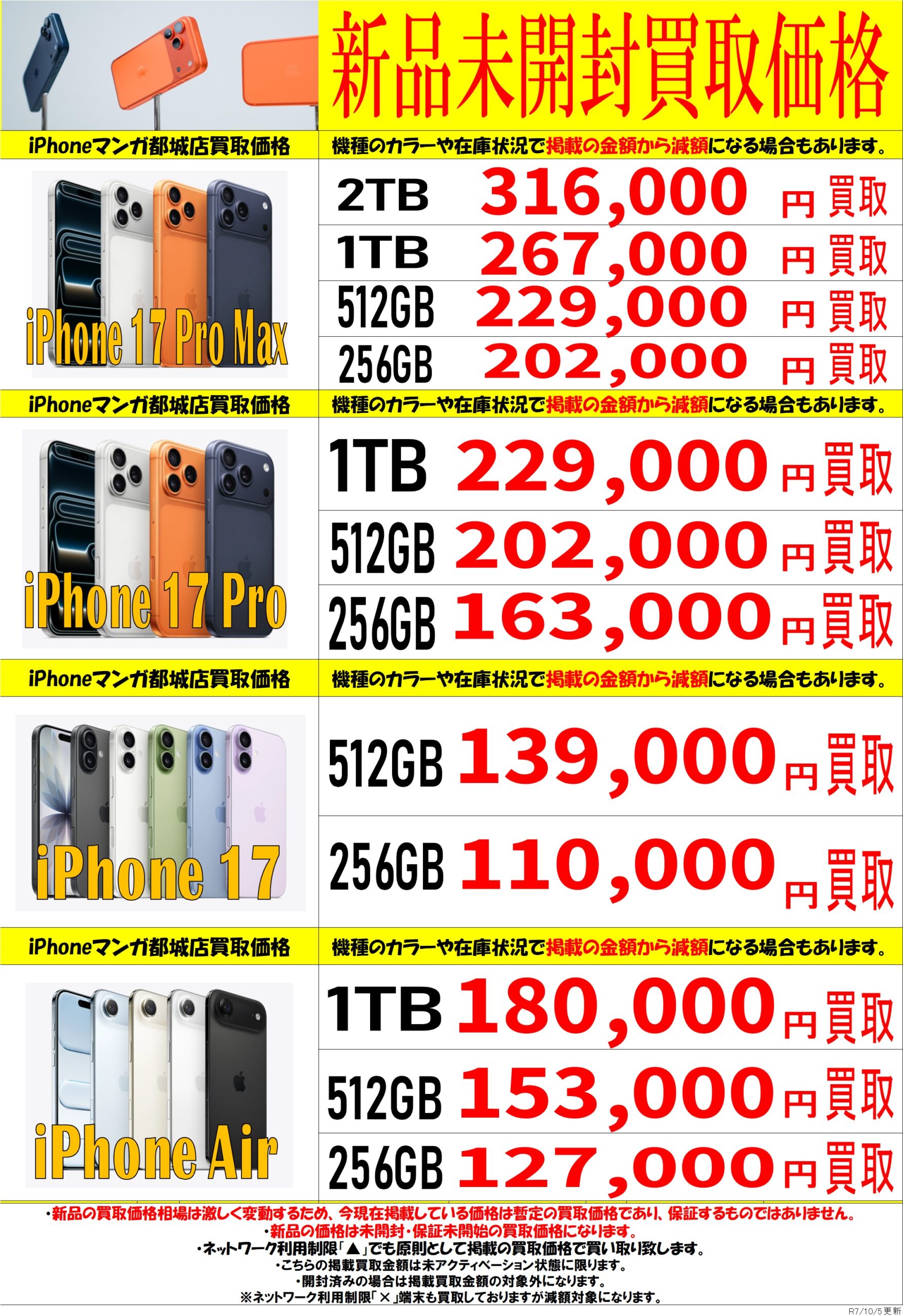 ※17系17pro系、新端末Airの買取は発売日からしばらくの間は価格の変動が大きい為、掲載の金額ではない場合がございますので予めご了承下さい。