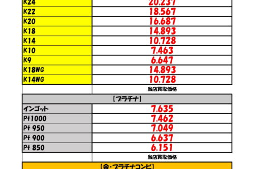 【都城店】本日の金・プラチナ・シルバー買取価格です!