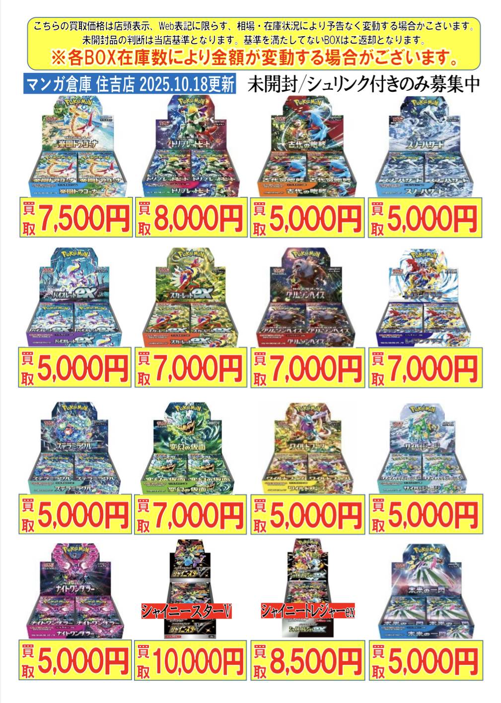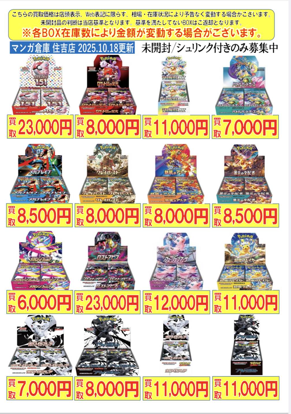 【住吉買取店店】ポケモンカード BOX買取価格を 更新致しました。 new 新着情報 買取情報 マンガ倉庫住吉買取店 トレカ 2025年10月18日 ポケモンカード BOX買取価格を 更新致しました。 ※2025/10/18現在の価格となります。 在庫状況などによってお値段が変動いたします。予めご了承ください。 **************** こちら↓もぜひチェックしてみてくださいね♪(*´▽`*) ・最新のイベント情報はこちら ・最新の買取情報はこちら