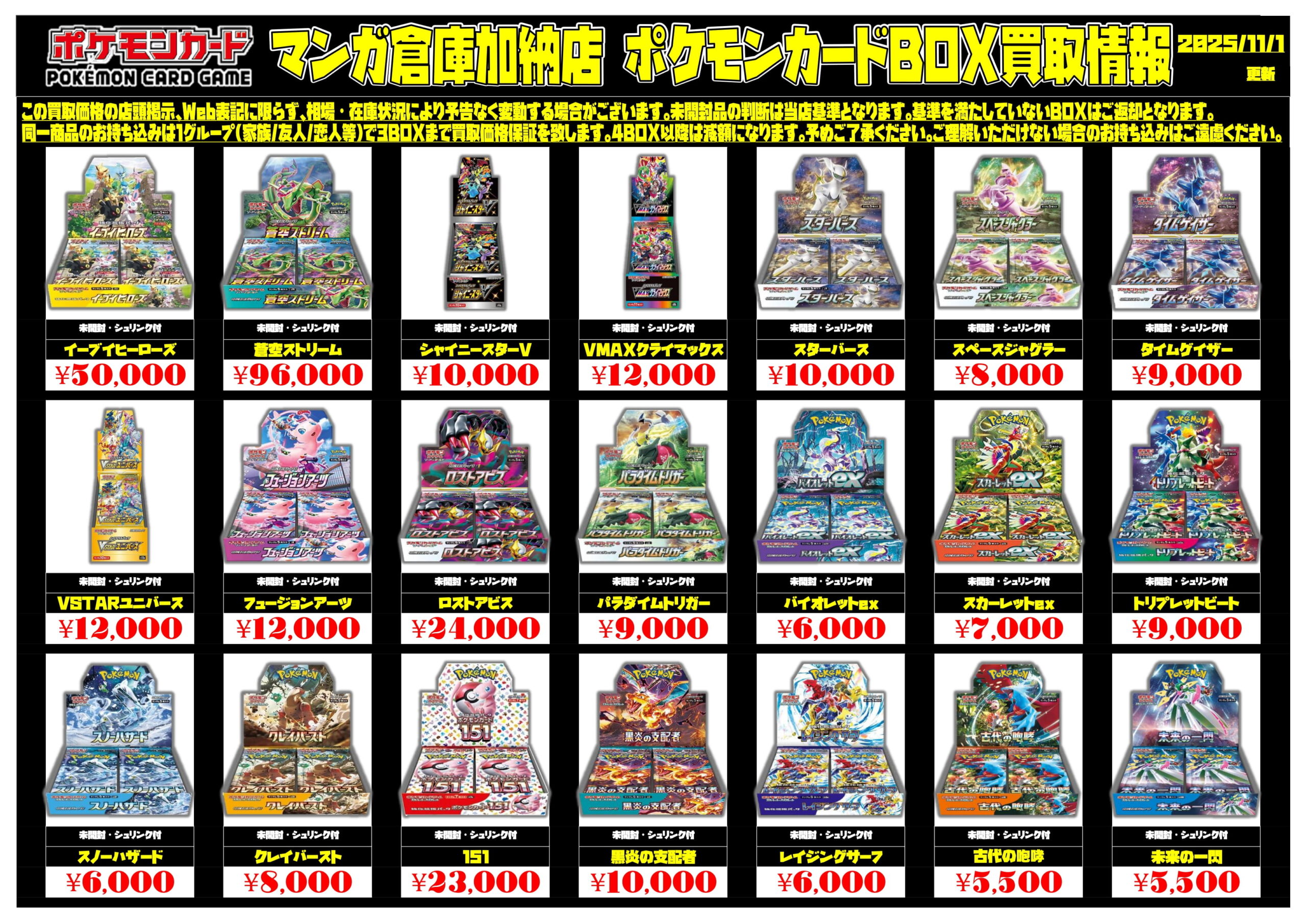 【加納店】ポケモンカード インフェルノX BOX買取保証・ポケモンカード BOX買取保証 更新! new 新着情報 買取情報 マンガ倉庫加納店 トレカ 2025年11月1日 ポケモンカード インフェルノX BOX買取保証 ポケモンカード BOX買取保証 更新 ※2025/11/1現在の価格となります。 在庫状況などによってお値段が変動いたします。予めご了承ください。 **************** こちら↓もぜひチェックしてみてくださいね♪(*´▽`*) ・最新のイベント情報はこちら ・最新の買取情報はこちら