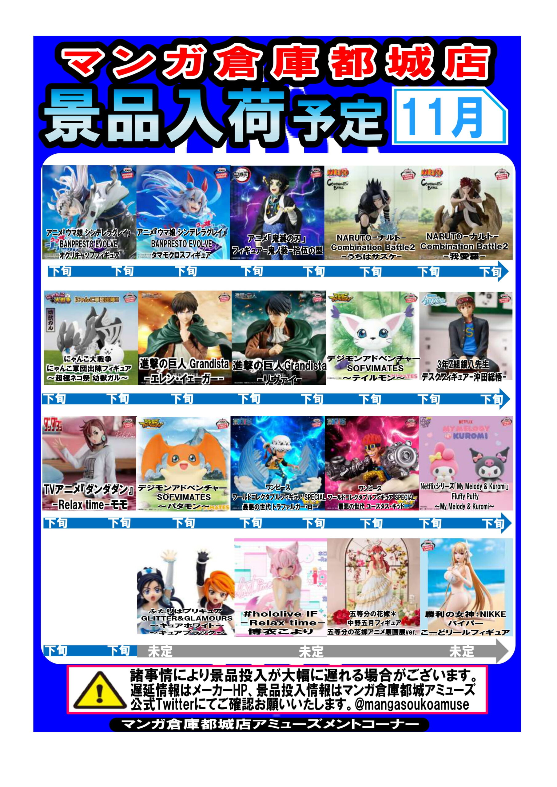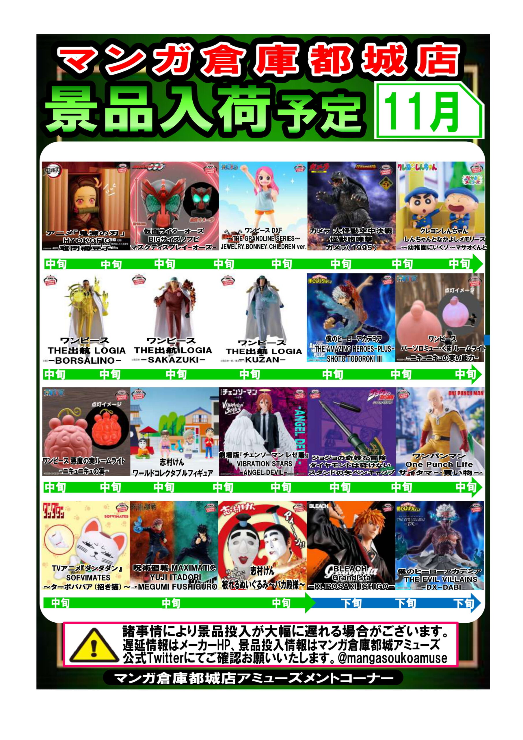【都城店】★アミューズ★〈景品入荷予定〉11月入荷分更新しました! new 新着情報 マンガ倉庫都城店 アミューズ 2025年11月1日 11月入荷予定のアミューズ景品一覧更新しました👍💥 ぜひご覧くださ~い!!! ★イベントカレンダーは👉こちら★