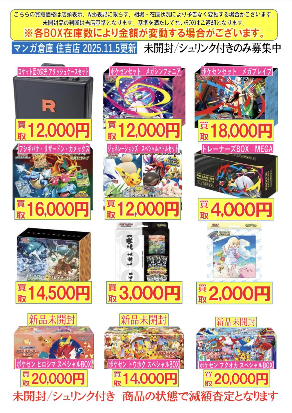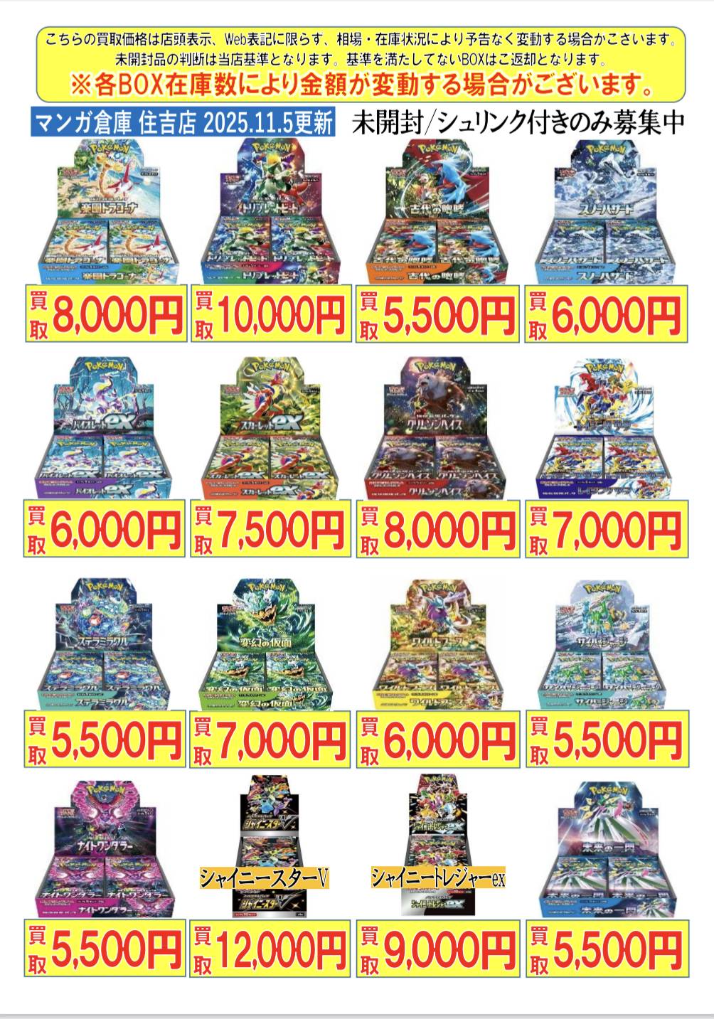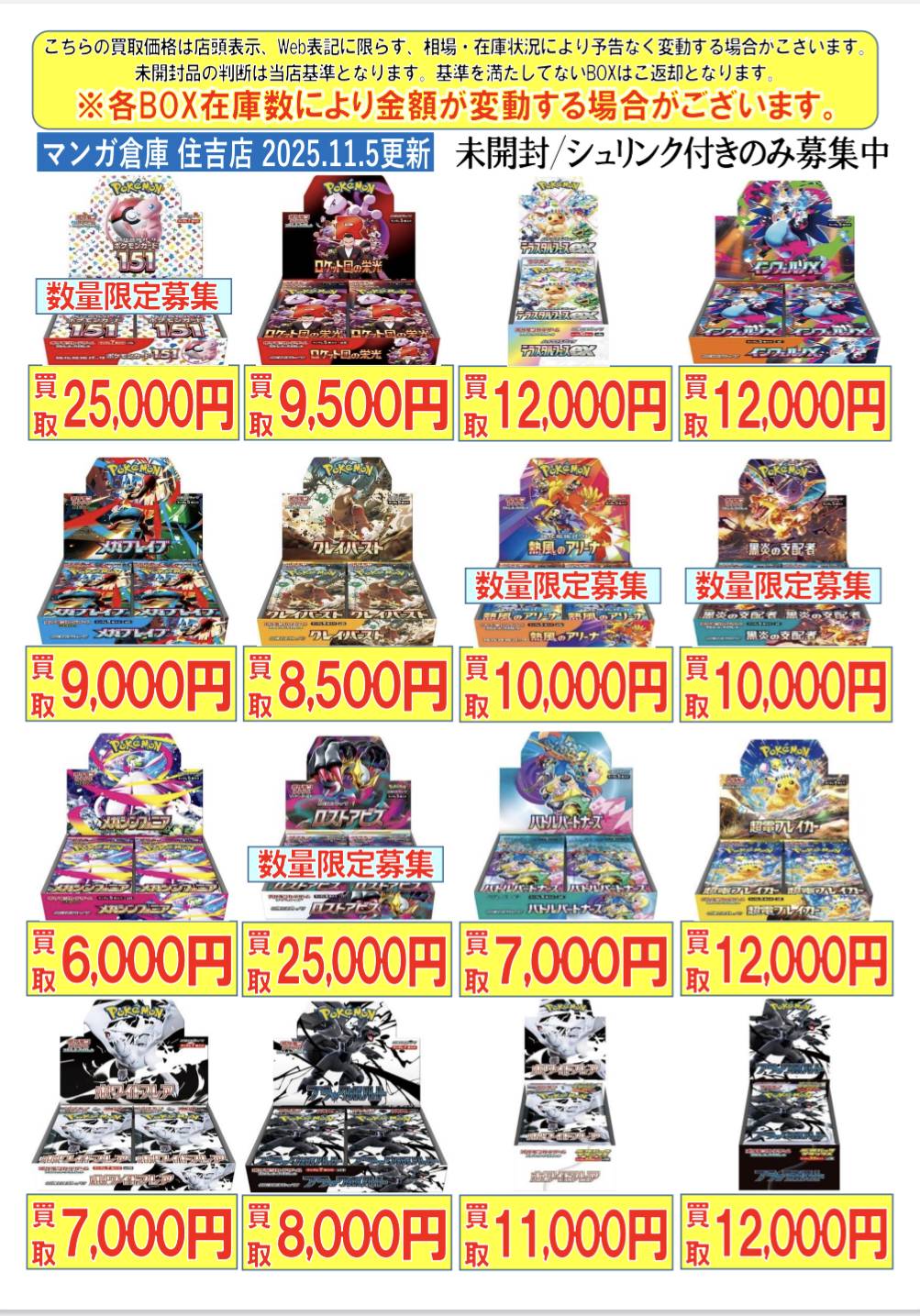 【住吉買取店】ポケモンカードBOX買取価格を更新致しました!■ new 新着情報 買取情報 マンガ倉庫住吉買取店 トレカ 2025年11月5日 ポケモンカードBOX買取価格を更新致しました! ※2025/11/5現在の価格となります。 在庫状況などによってお値段が変動いたします。予めご了承ください。 **************** こちら↓もぜひチェックしてみてくださいね♪(*´▽`*) ・最新のイベント情報はこちら ・最新の買取情報はこちら