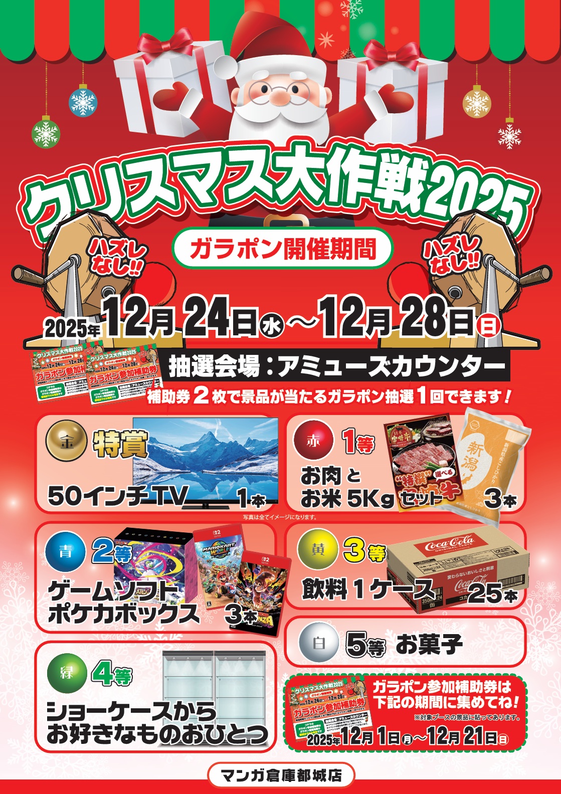 【都城店|加納店|住吉店|トレトレ倉庫日南店】🎄❄クリスマス特別イベント開催❗️❗️❗️🎄❄ new 新着情報 イベント情報 トレトレ倉庫日南店 マンガ倉庫加納店 マンガ倉庫住吉買取店 マンガ倉庫都城店 おもちゃ・ホビー アイドル アイドル アミューズ ガチャ ゲーム コミック/書籍 トレカ ファッション 家電/雑貨 2025年11月30日 クリスマス特別イベント開催❗️❗️❗️ 12月より❗️特別なセールやくじ引きなどができるクリスマスイベントを随時開催致します‼️ また❗️クリスマス抽選券やお正月お年玉クーポンも配布致します‼️ 🎄【都城店】🎄 開催日時等、詳しくはイベントPOPかスタッフまでお問い合わせ下さい‼️ 皆様のご来店お待ちしております‼️✨️ **************** こちら↓もぜひチェックしてみてくださいね♪(*´▽`*) ・最新のイベント情報はこちら ・最新の買取情報はこちら