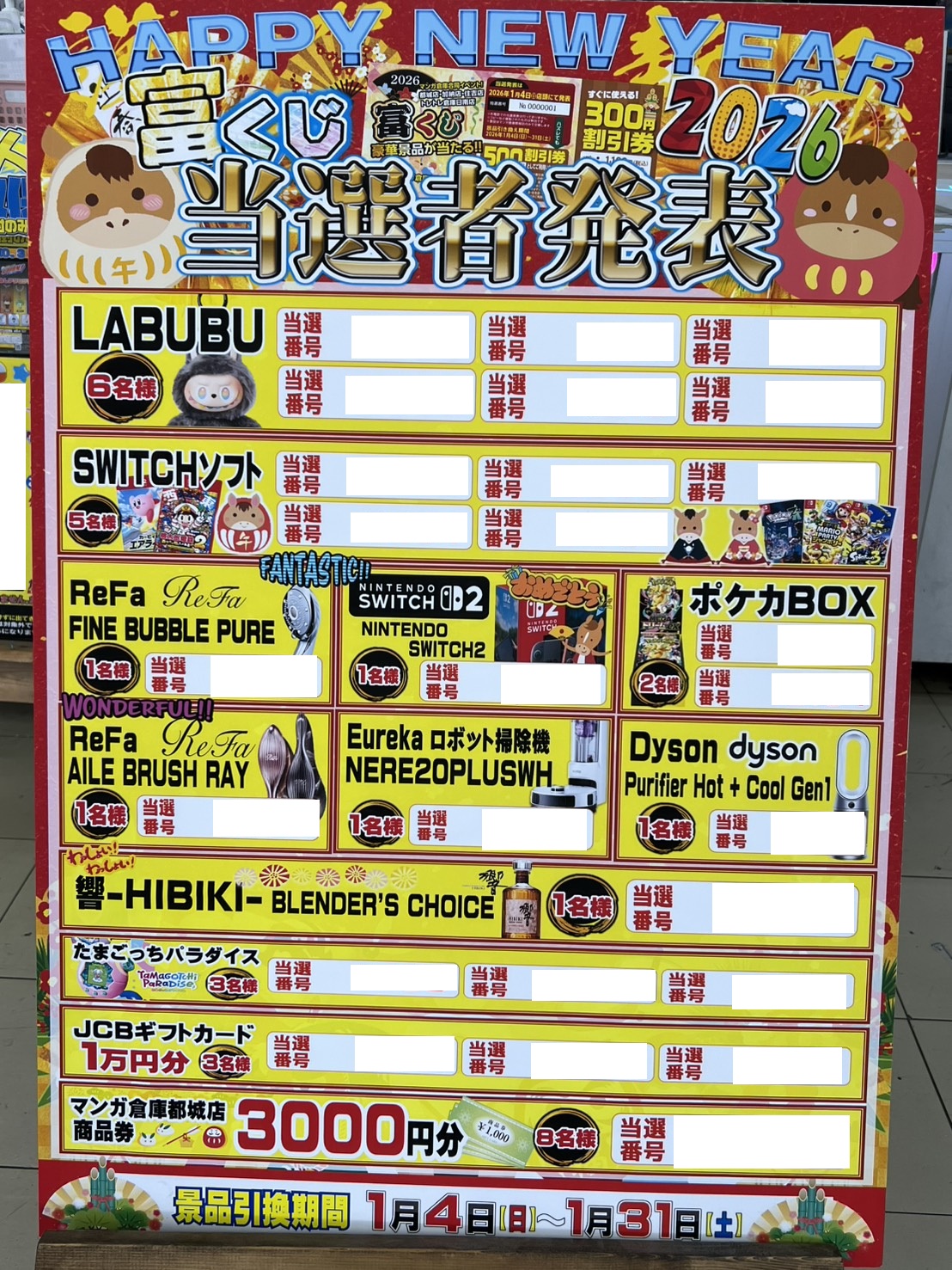 【都城店】富くじ2026当選者発表!■ 新着情報 イベント情報 マンガ倉庫都城店 お知らせ 2026年1月4日 超豪華景品が当たる 富くじ2026当選者番号発表! 店舗にてご確認下さい! Nintendo Switch2 LABUBU 他人気の家電商品ご用意してます! はずれても500円の割引券としてもご利用頂けます。