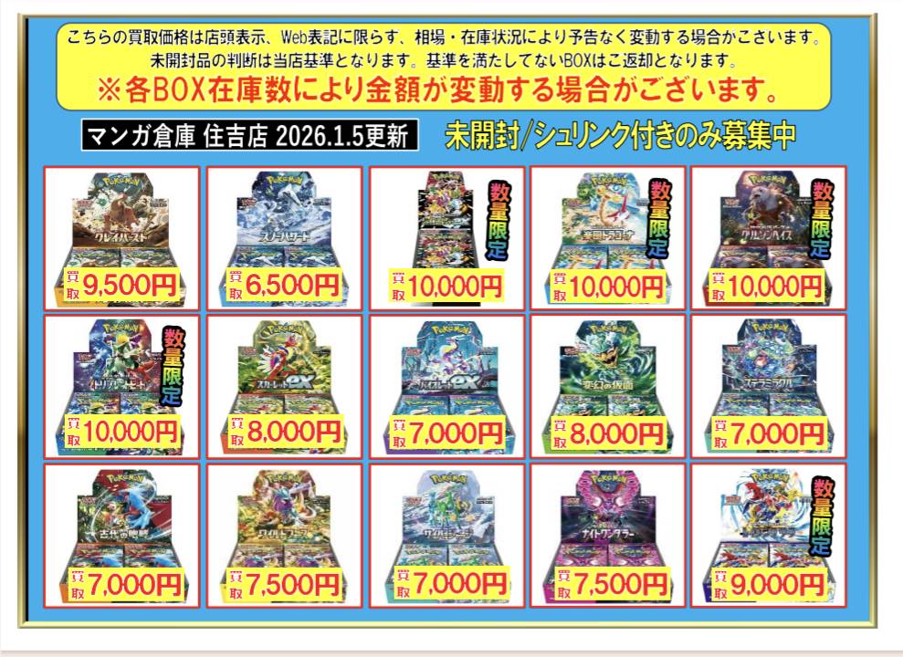 【住吉買取店】ポケモンカードBOX買取金額を更新致しました!■ new 新着情報 買取情報 マンガ倉庫住吉買取店 トレカ 2026年1月5日 ポケモンカードBOX買取金額を更新致しました! ※2026/1/5現在の価格となります。 在庫状況・状態によってお値段が変動いたします。予めご了承ください。 **************** こちら↓もぜひチェックしてみてくださいね♪(*´▽`*) ・最新のイベント情報はこちら ・最新の買取情報はこちら