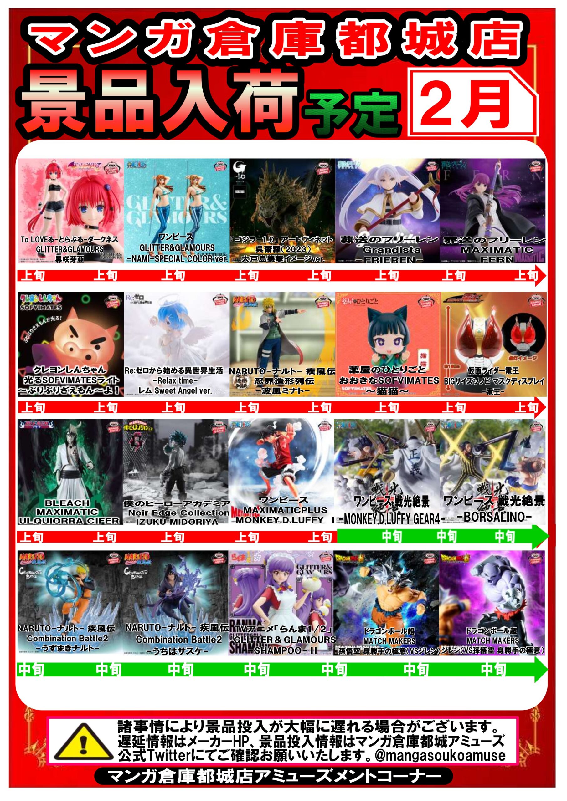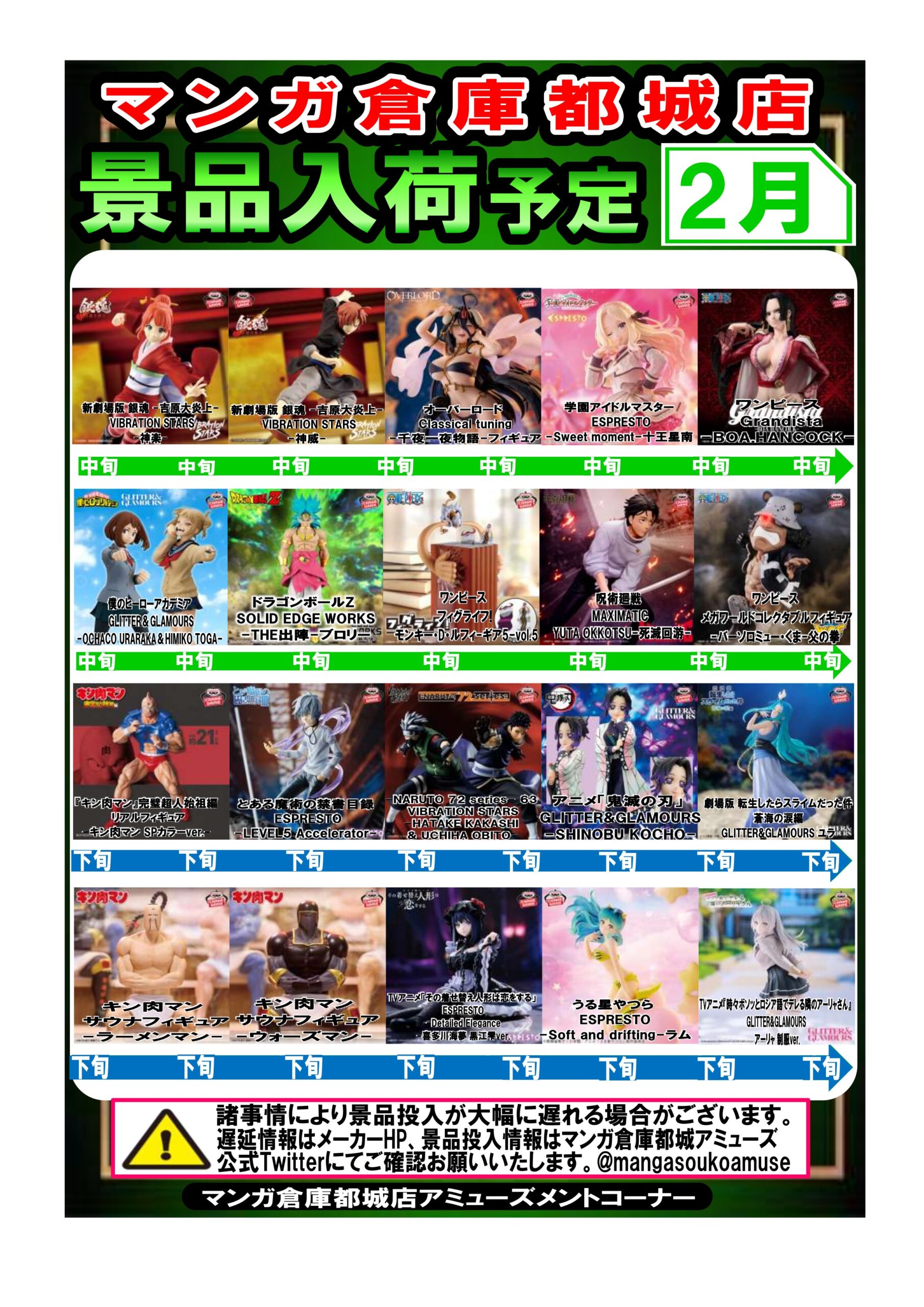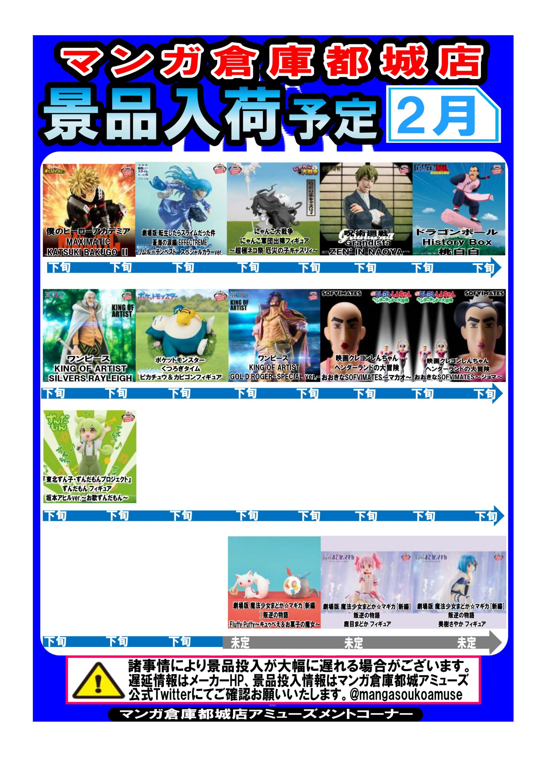 【都城店】★アミューズ★〈景品入荷予定〉2月入荷分更新しました! new 新着情報 マンガ倉庫都城店 アミューズ 2026年2月1日 2月入荷予定のアミューズ景品一覧更新しました👍💥 ぜひご覧くださ~い!!! ★イベントカレンダーは👉こちら★