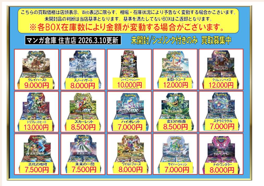 【住吉買取店店】ポケモンカード BOX買取金額を更新致しました! new 新着情報 買取情報 マンガ倉庫住吉買取店 トレカ 2026年3月10日 ポケモンカード BOX買取金額を更新致しました! ※2026/3/10現在の価格となります。 在庫状況・状態によってお値段が変動いたします。予めご了承ください。 **************** こちら↓もぜひチェックしてみてくださいね♪(*´▽`*) ・最新のイベント情報はこちら ・最新の買取情報はこちら