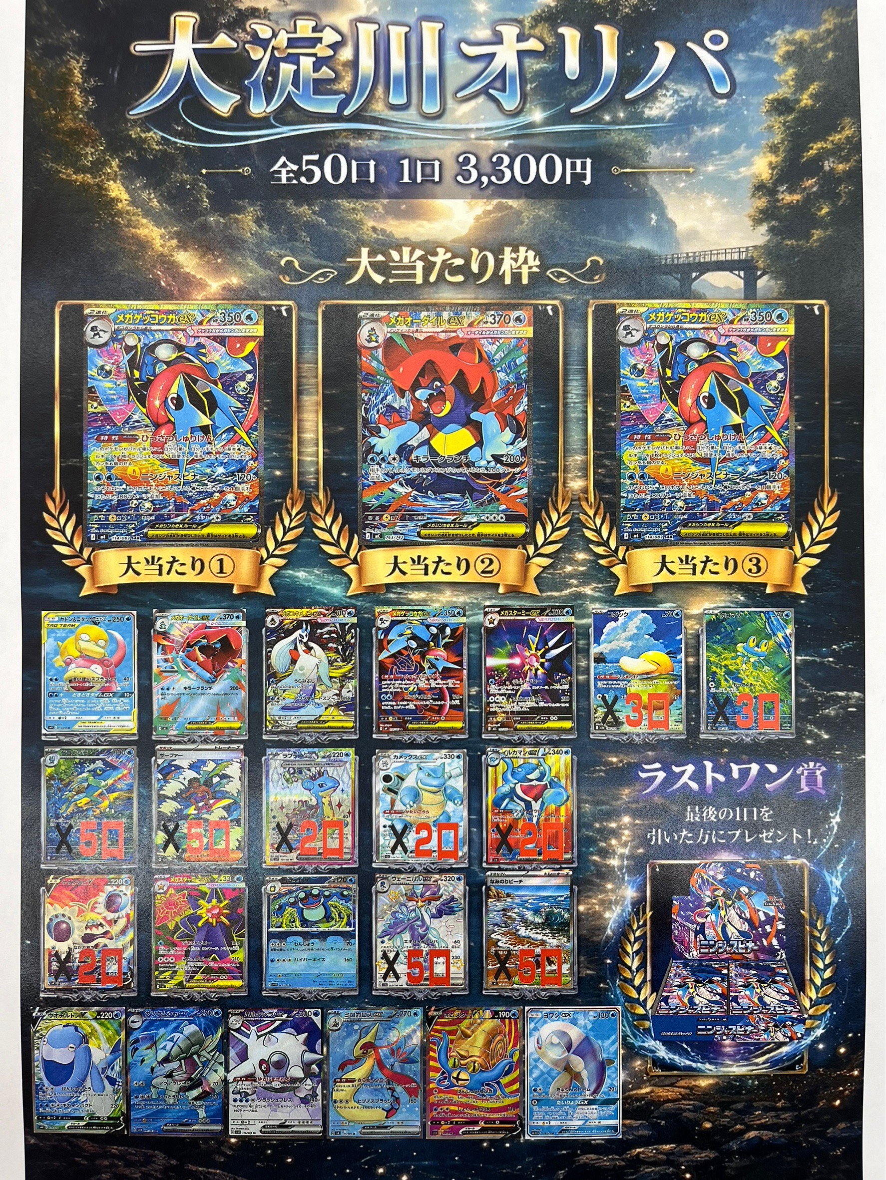 【住吉買取店】ポケモンカード 大淀川オリパ販売開始しました!■ 新着情報 マンガ倉庫住吉買取店 ガチャ トレカ 2026年3月29日 ポケモンカード 大淀川オリパ販売開始しました! 全部50口 1口3,300円 大当たり メガゲッコウガex SAR2枚、メガオーダイルex SAR 必ず画像内確定で当たります! ※全て中古カードを使用している為、傷がある場合が御座います。予めご了承下さい。