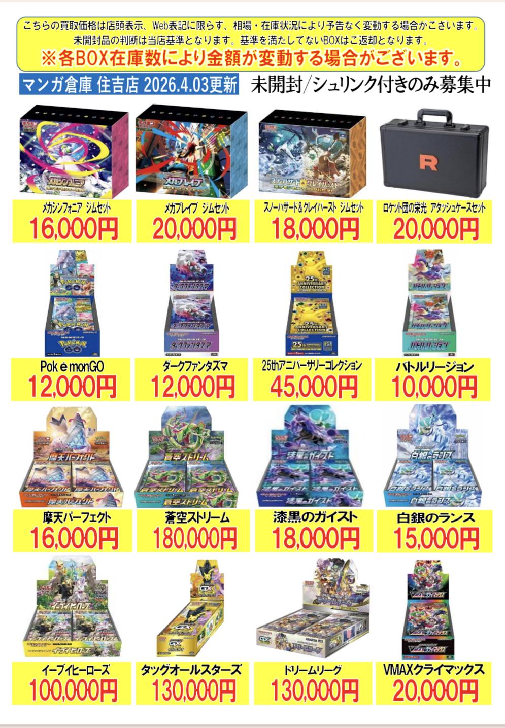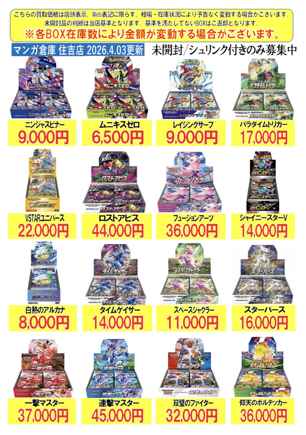 【住吉買取店】ポケモンカード BOX買取金額を更新致しました。 new 新着情報 買取情報 マンガ倉庫住吉買取店 トレカ 2026年4月3日 ポケモンカード BOX買取金額を更新致しました。 ※2026/4/3現在の価格となります。 在庫状況・状態によってお値段が変動いたします。予めご了承ください。 **************** こちら↓もぜひチェックしてみてくださいね♪(*´▽`*) ・最新のイベント情報はこちら ・最新の買取情報はこちら