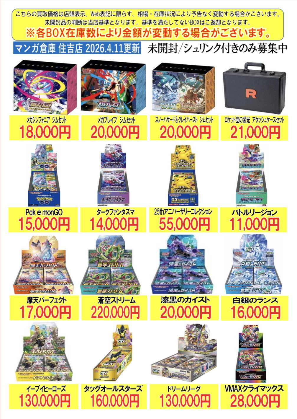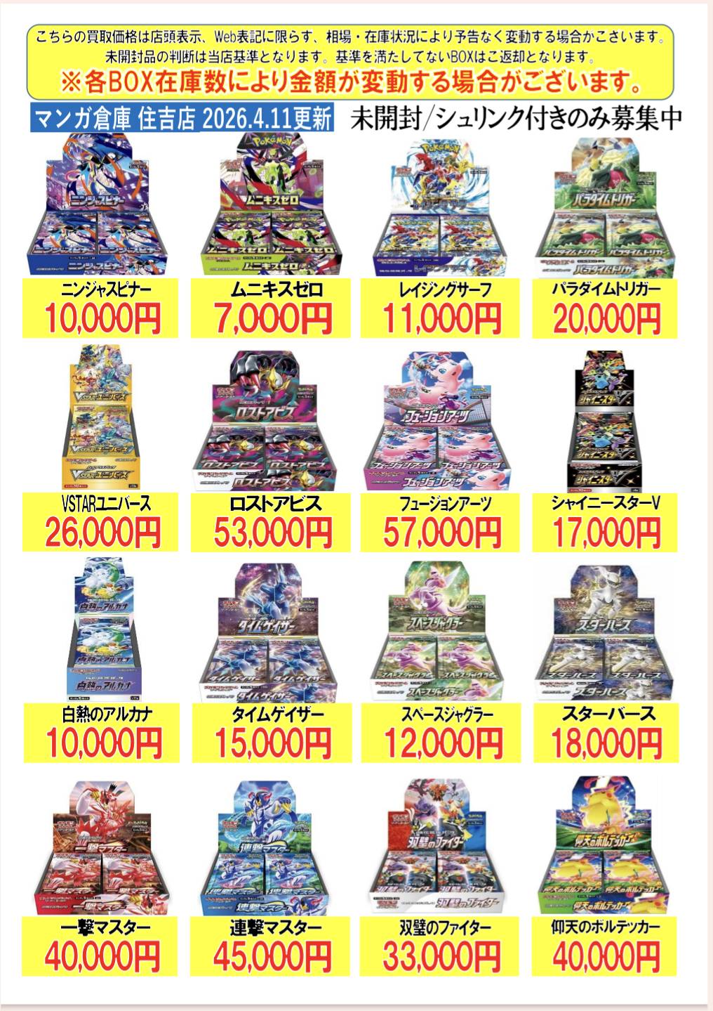 【住吉買取店】ポケモンカードBOX買取金額を更新致しました!! new 新着情報 買取情報 マンガ倉庫住吉買取店 トレカ 2026年4月11日 住吉買取店 ポケモンカードBOX買取金額を更新致しました!! ※2026/4/11現在の価格となります。 在庫状況・状態によってお値段が変動いたします。予めご了承ください。 **************** こちら↓もぜひチェックしてみてくださいね♪(*´▽`*) ・最新のイベント情報はこちら ・最新の買取情報はこちら