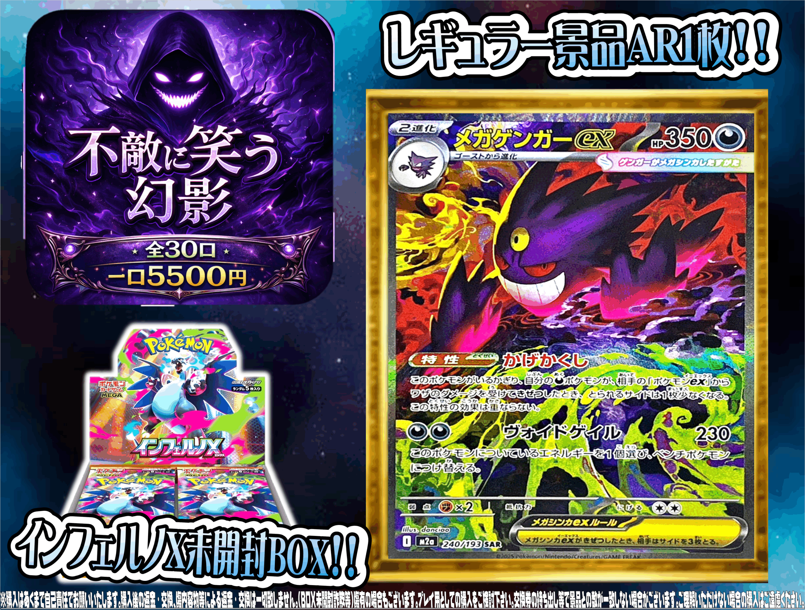 【加納店】ポケモンカード ⚡️本日発売開始⚡️【メガゲンガーSAR争奪&BOXオリジナルパック】 新着情報 マンガ倉庫加納店 トレカ 2026年4月18日 加納店 ポケモンカード ⚡️本日発売開始⚡️ お待たせしました! 【メガゲンガーSAR争奪&BOXオリジナルパック】、ただいまより販売スタートです! 💥今回の大当たりは… 【メガゲンガー SAR】!!💥 異次元より現れるゴーストキング、その最高峰の一枚を封入! さらに『インフェルノX BOX』も封入しております! ✅1口 5,500円 ✅限定 全30口 ✅AR1枚確定! 神出鬼没の最強ゴーストを手に入れるのは誰だ!?