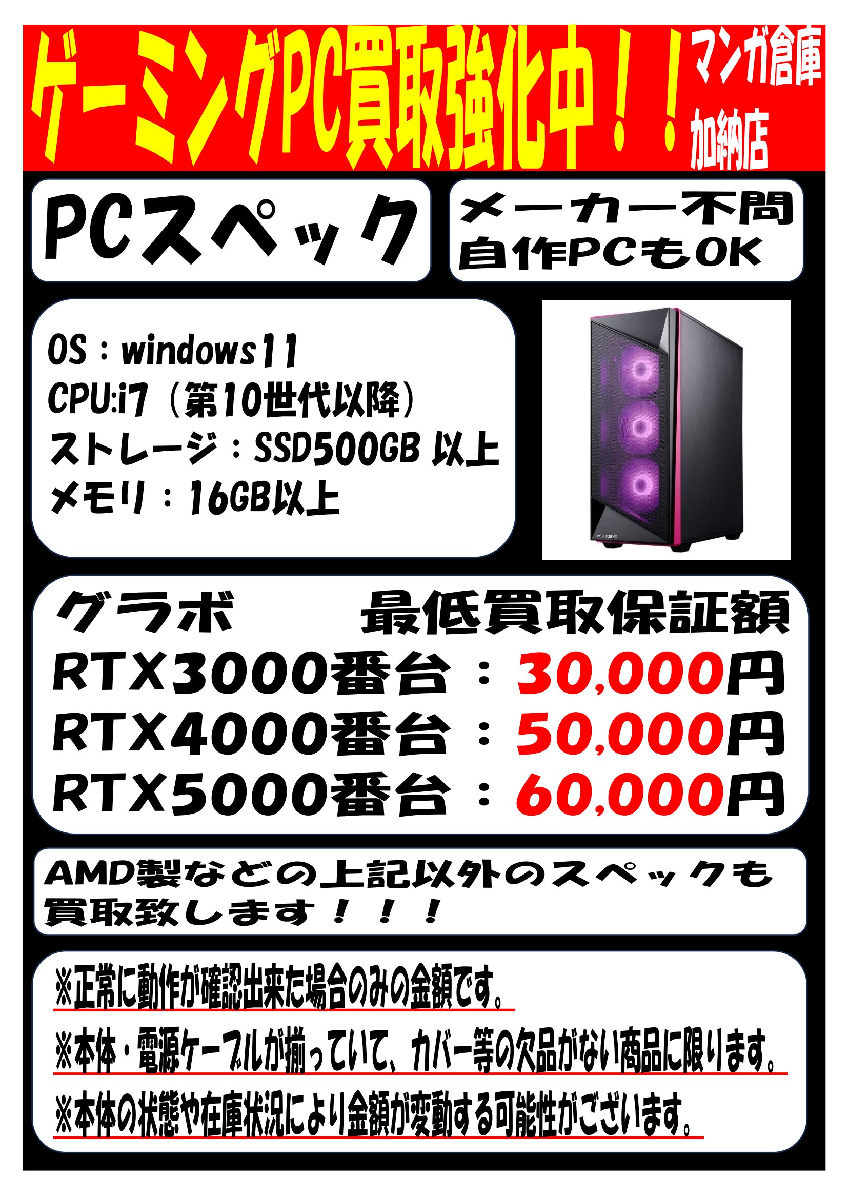 【加納店】ゲーミングPC 買取強化中です! 新着情報 買取情報 マンガ倉庫加納店 家電/雑貨 2026年4月20日 ゲーミングPCの買取を強化中です!! PC以外にもゲーミングデバイス等の買取も行ってます!! 査定だけでもOK!是非マンガ倉庫加納店にお持ちください! ※2026/4/20現在の価格となります。 在庫状況・状態によってお値段が変動いたします。予めご了承ください。 **************** こちら↓もぜひチェックしてみてくださいね♪(*´▽`*) ・最新のイベント情報はこちら ・最新の買取情報はこちら