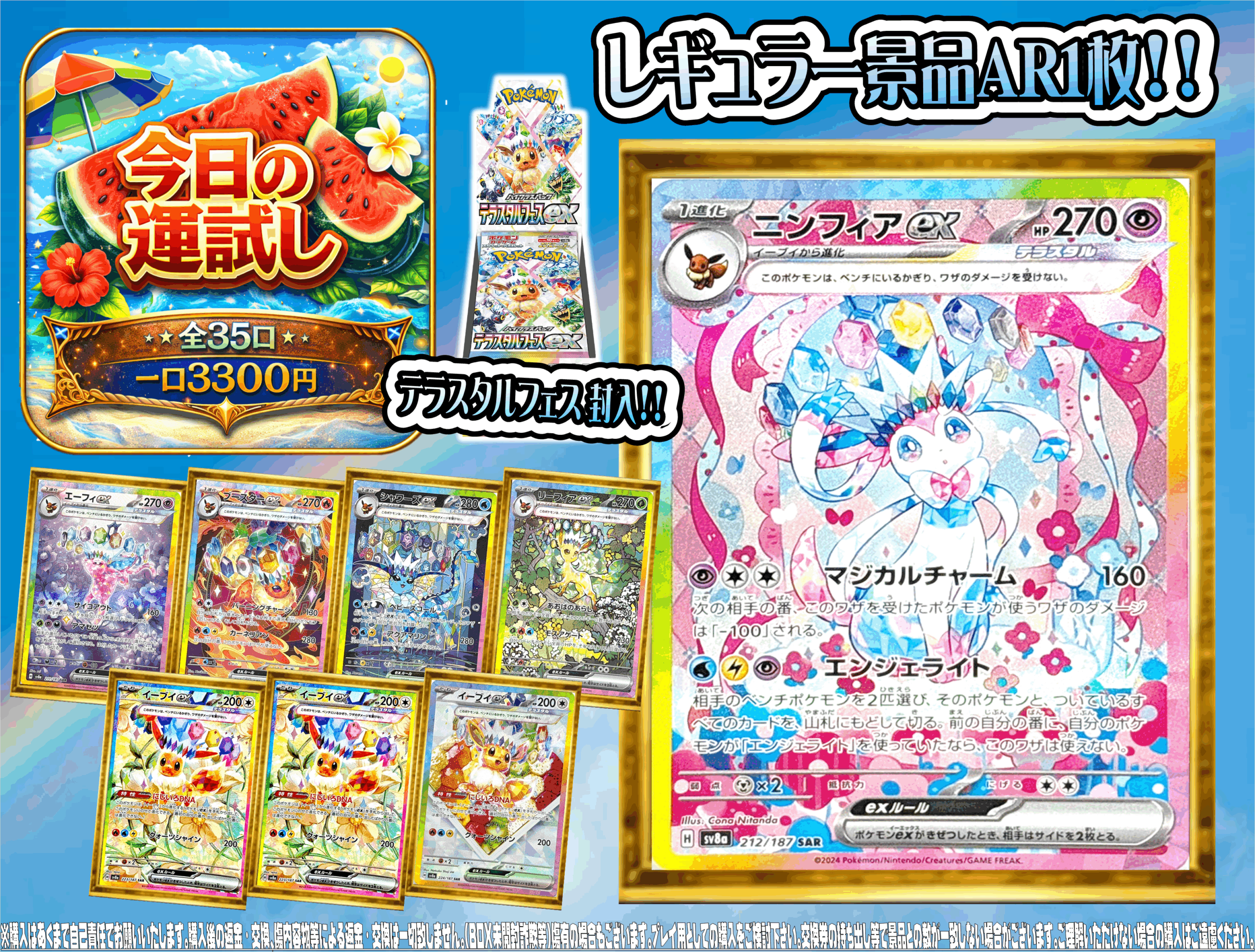 【加納店】ニンフィアSAR争奪&BOXオリジナルパック 販売開始! new 新着情報 マンガ倉庫加納店 トレカ 2026年4月22日 ⚡️本日発売開始⚡️ お待たせしました! 【ニンフィアSAR争奪&BOXオリジナルパック】、ただいまより販売スタートです! 💥今回の大当たりは… 【ニンフィア SAR】!!💥 絆の化身、その最高峰の一枚を封入! さらに『テラスタルフェスBOX』も封入しております! ✅1口 3,300円 ✅限定 全35口 ✅AR1枚確定!