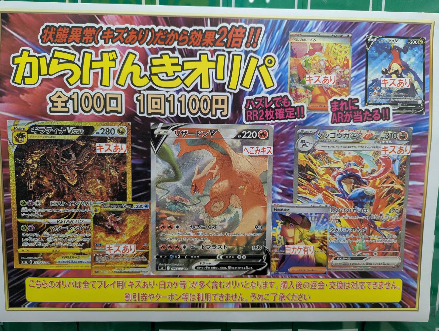 【住吉買取店】からげんきオリパ販売スタート! new 新着情報 マンガ倉庫住吉買取店 トレカ 2026年4月27日 ポケモンカード 全100口 1パック1100円 状態異常(キズあり)だから効果2倍 からげんきオリパ販売スタート致しました!!