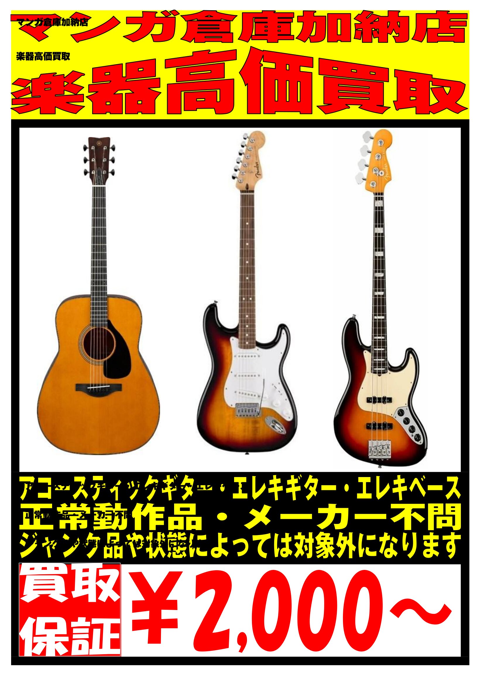 【加納店】楽器の買取保証を始めました! 新着情報 買取情報 マンガ倉庫加納店 楽器 2026年4月27日 加納店 楽器の買取保証を始めました! 家で眠ってるギターやベースがありましたら是非マンガ倉庫加納店に!! 正常動作品ならば最低2000円で買取致します! 査定だけでも持込お待ちしてます! ※2026/4/27 現在の価格となります。 在庫状況・状態によってお値段が変動いたします。予めご了承ください。