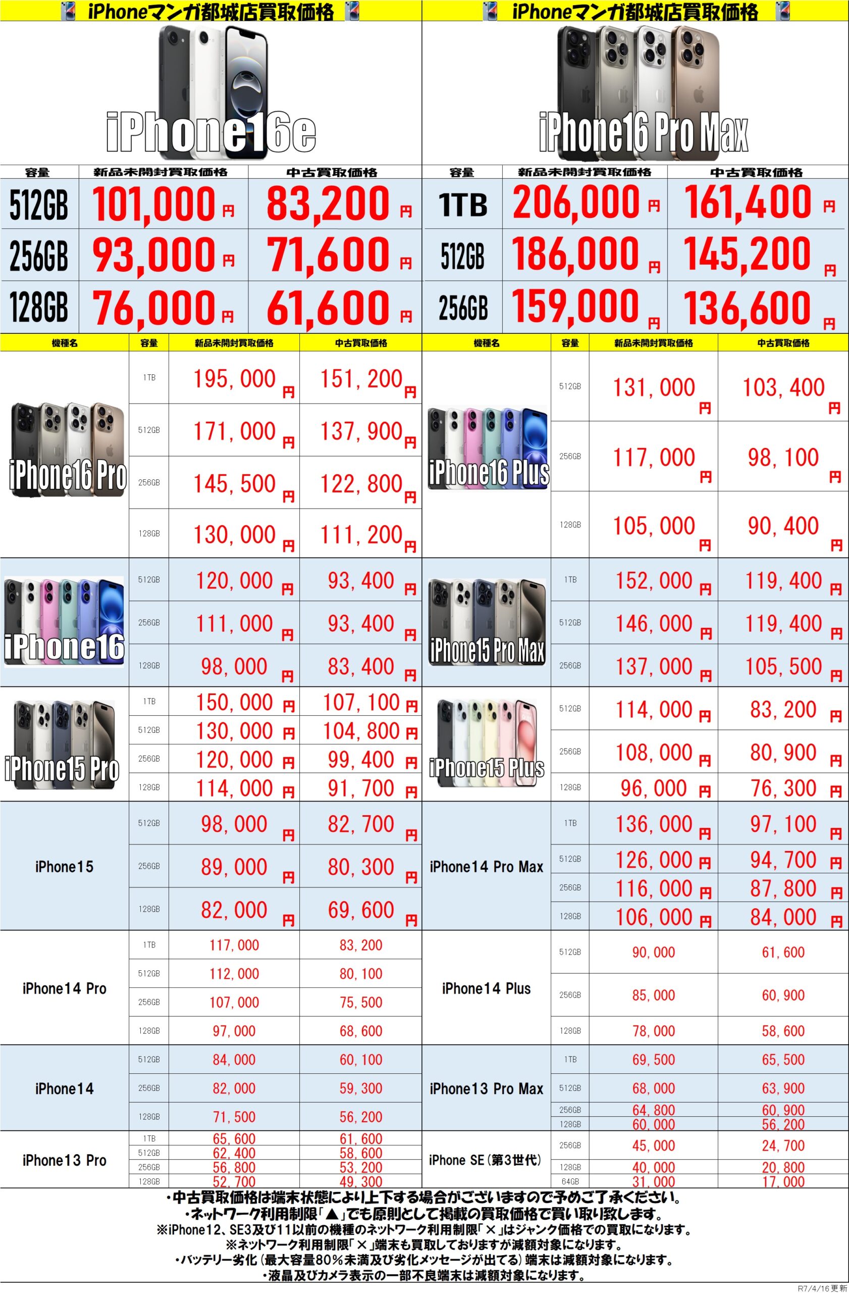 【都城店】iPhone買取価格更新 新着情報 買取情報 マンガ倉庫都城店 家電/雑貨 2025年4月16日 iPhone高価買取! 未使用品、中古品、壊れたiPhoneなんでも買取ります! 最新端末から使っていない古い端末も買取ならマンガ倉庫都城店にお任せ下さい! ※2025/4/16現在の価格となります。 在庫状況などによってお値段が変動いたします。予めご了承ください。 **************** こちら↓もぜひチェックしてみてくださいね♪(*´▽`*) ・最新のイベント情報はこちら ・最新の買取情報はこちら
