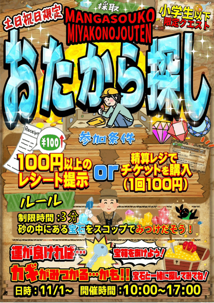 マンガ倉庫都城店緊急クエスト❗️ 11月の土日祝日、小学生以下限定でマン…