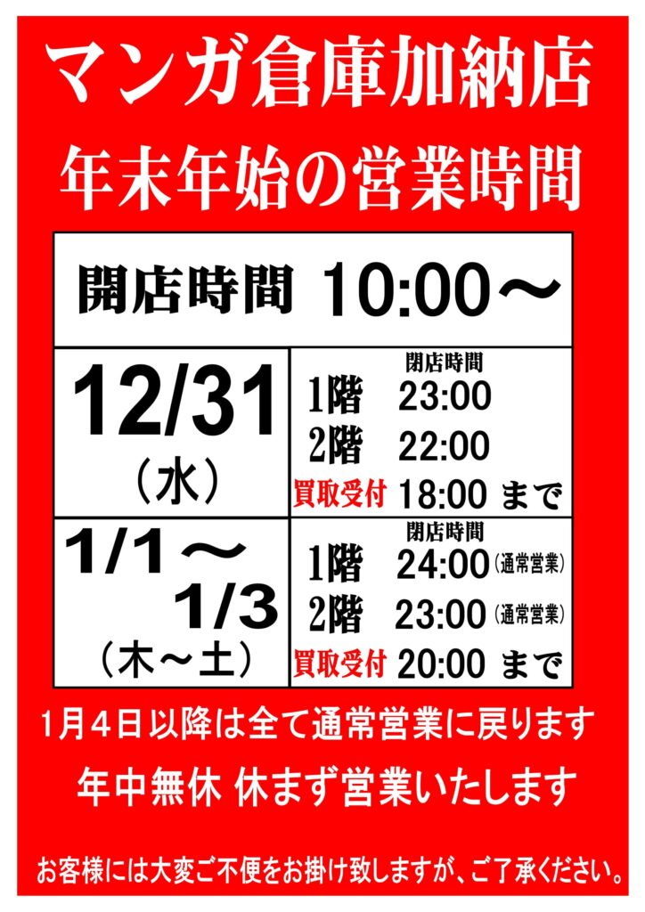 マンガ倉庫加納店 年末年始の営業時間のご案内