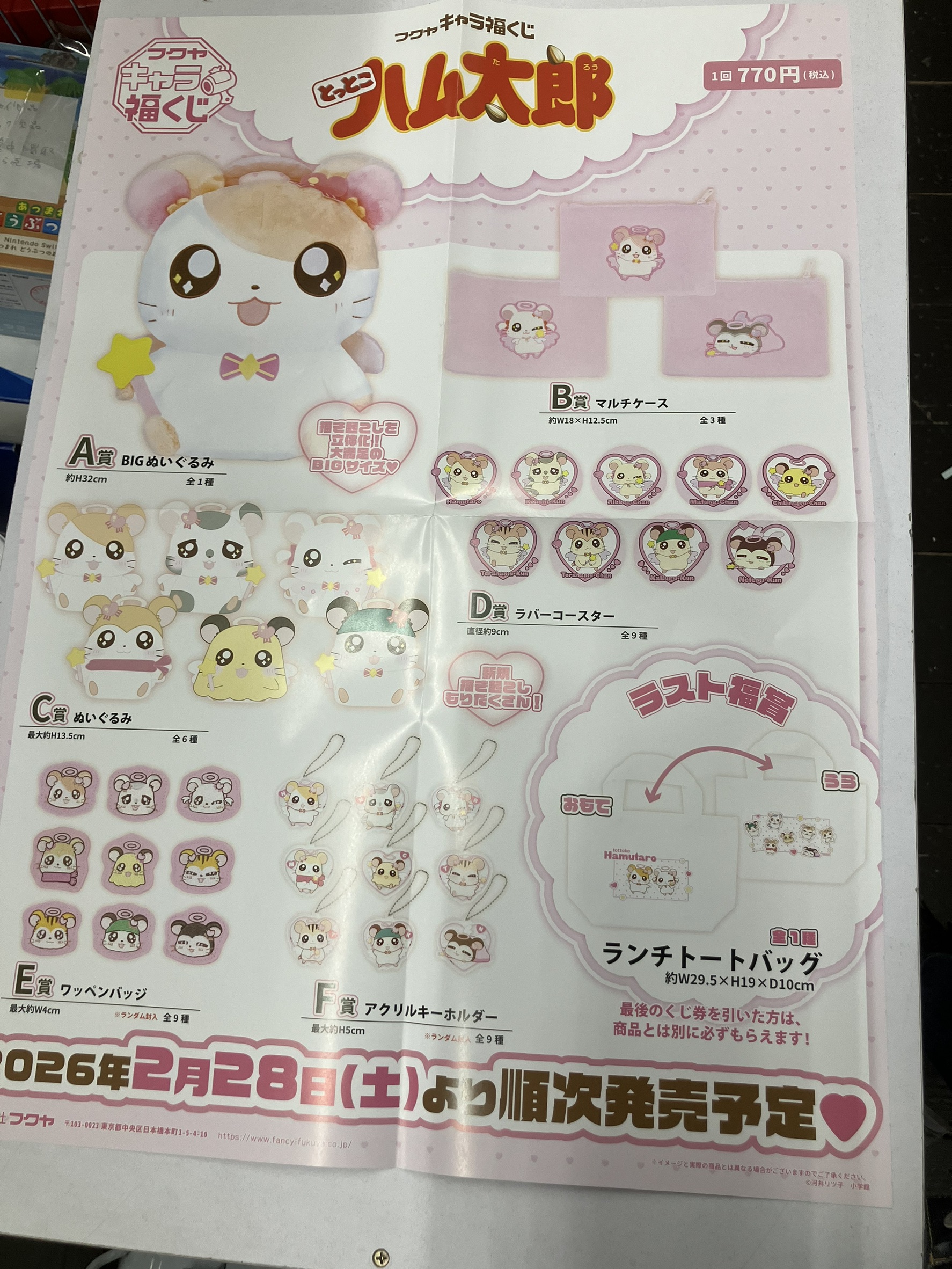 【都城店】くじ配送遅延商品入荷情報!!《キャラ福くじ とっとこハム太郎》 マンガ倉庫都城店 お知らせ おもちゃ・ホビー 2026年2月28日 くじ入荷情報!! 配送遅延により販売延期をしていた「キャラ福くじ とっとこハム太郎」ですが、到着致しましたので! 本日(2/28)15時より販売を開始いたします!! 1ロットのみの入荷となっているのでお買い求めはお早めに!!